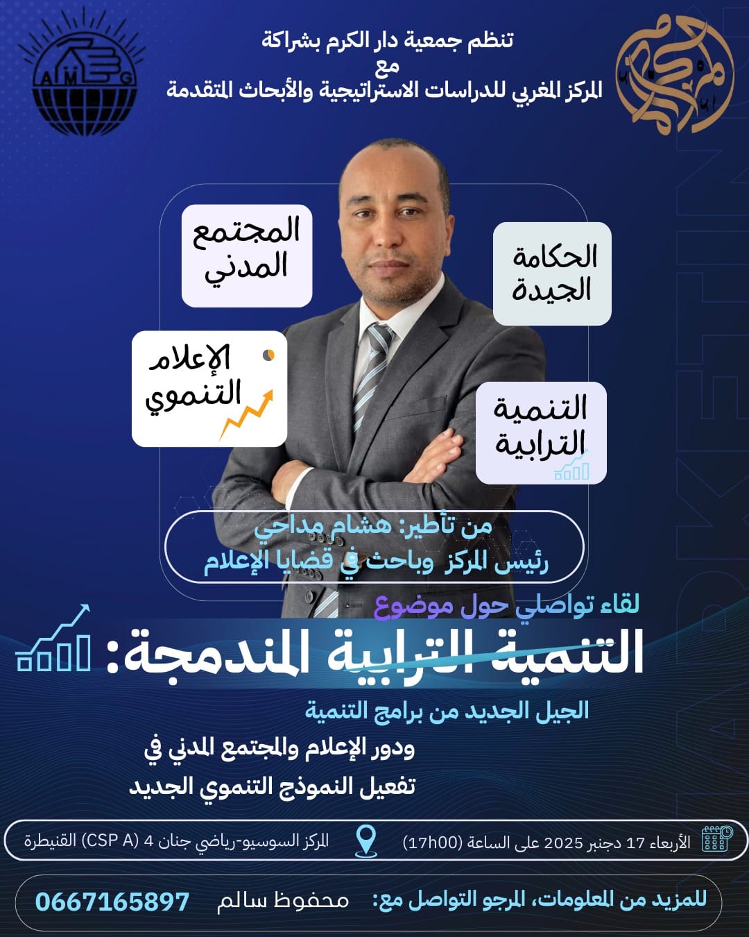 في إطار النقاش العمومي المتواصل حول سبل تنزيل الجيل الجديد من برامج التنمية الترابية المندمجة، تم تنظيم لقاء تواصلي علمي من طرف جمعية دار الكرم بشراكة مع المركز المغربي للدراسات الإستراتيجية والأبحاث المتقدمة بمدينة القنيطرة، خُصص لموضوع: