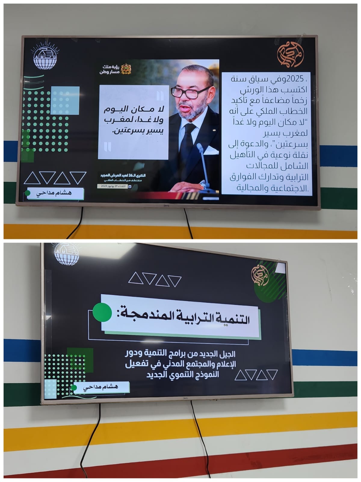 وقد أطر هذا اللقاء هشام مداحي، باحث في قضايا الإعلام ورئيس المركز المغربي للدراسات الاستراتيجية والأبحاث المتقدمة، حيث قدّم عرضًا تأطيريًا شاملاً، انطلق فيه من المرجعيات الكبرى التي تؤطر ورش التنمية الترابية بالمغرب، وعلى رأسها التوجيهات الملكية السامية، خاصة ما ورد في خطاب عيد العرش، والدعوة الصريحة إلى عدم القبول بمغرب يسير بسرعتين، وإلى اعتماد جيل جديد من برامج التنمية المرتكزة على العدالة المجالية والاجتماعية.
